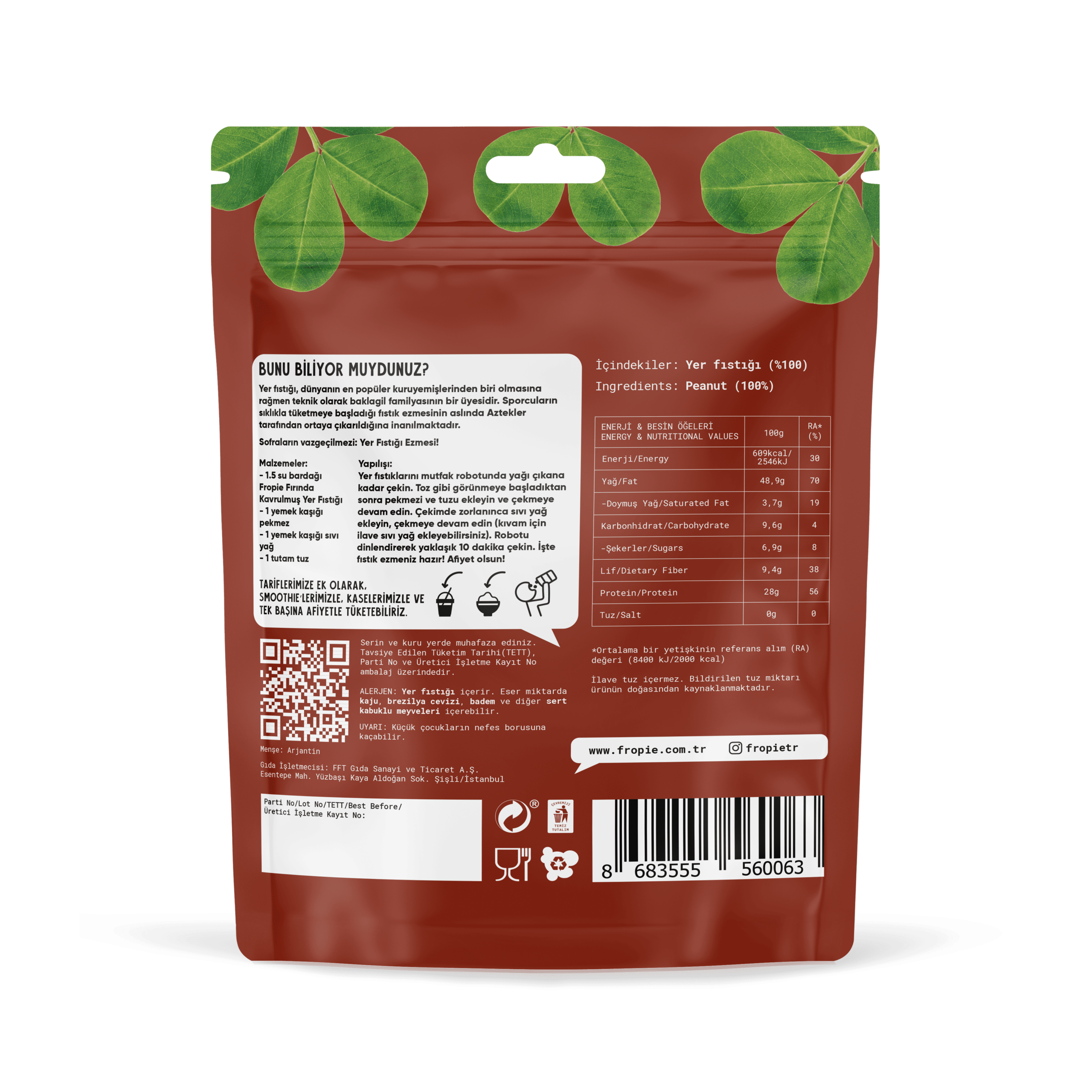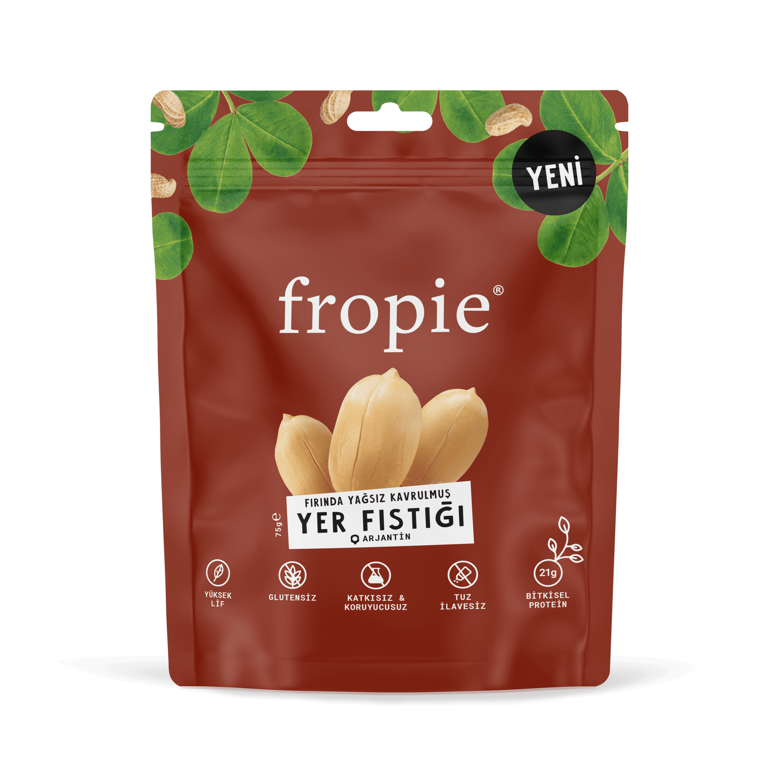 Kuruyemiş keyfini en saf ve hafif haliyle yaşamanız için özenle hazırlanan Fropie Arjantin Fıstığı ile tanışın! Dünya kuruyemişleri arasında eşsiz lezzetiyle öne çıkan birinci sınıf Arjantin yer fıstığı, ilave yağ kullanılmadan özel fırınlarda kavrulur. Bu sayede ortaya suçluluk duymadan, keyifle tüketebileceğiniz mükemmel bir yağsız fırınlanmış yer fıstığı çıkar. Tuz ilavesiz formülüyle tansiyon ve ödem endişesi yaşamadan atıştırabileceğiniz bu tuzsuz kavrulmuş fıstık, günün her anında yanınızda.